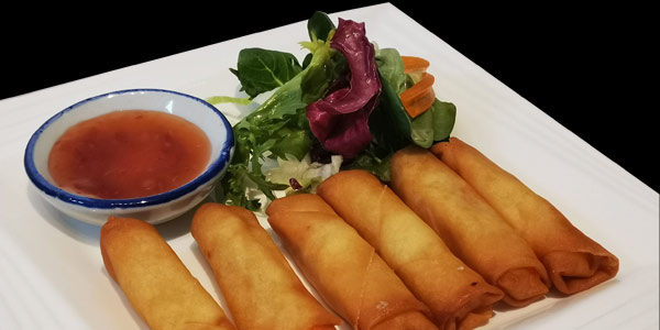 C Tre små rätter: Vårrullar, Friterad och Röd thaicurry kyckling
